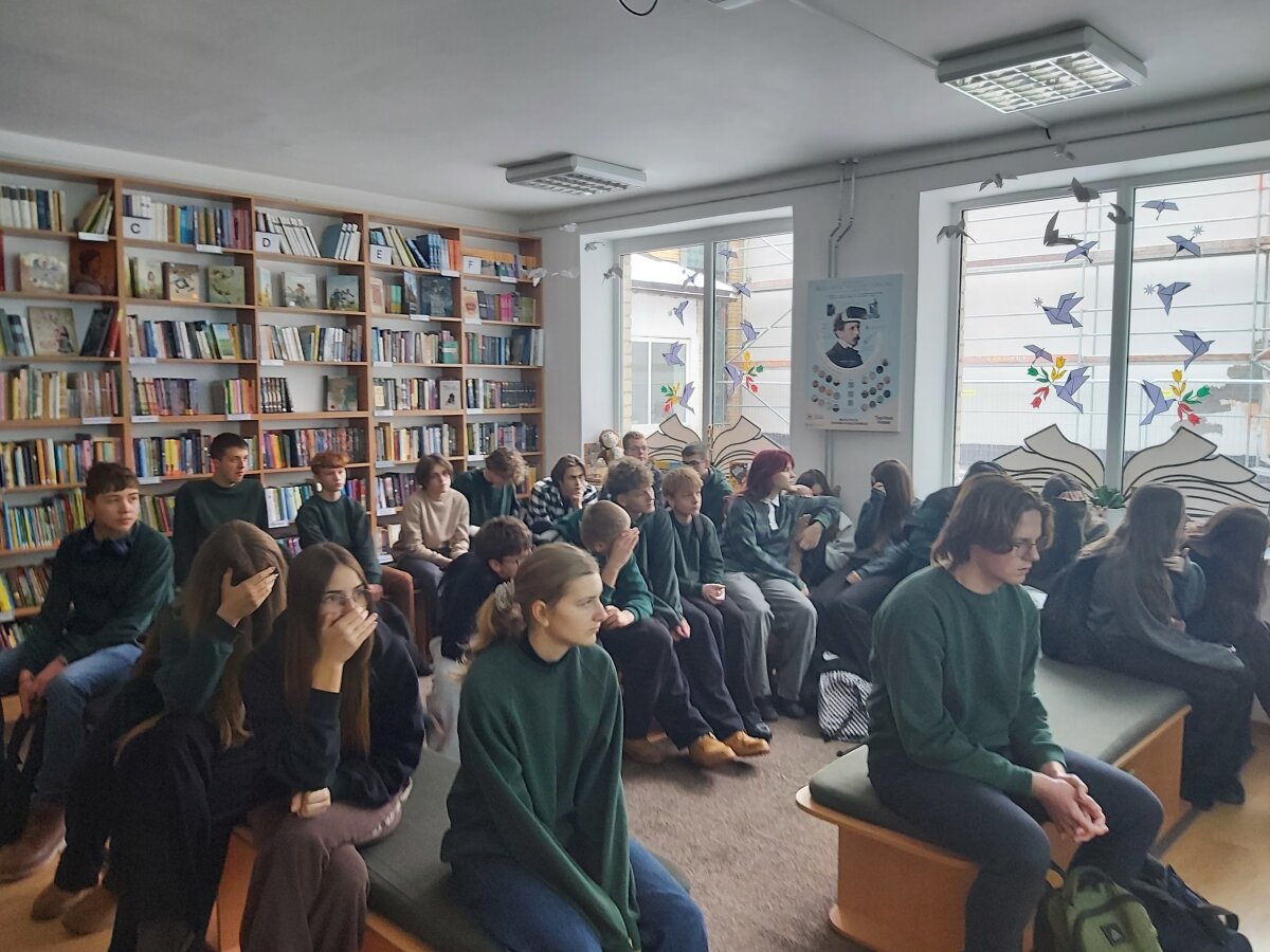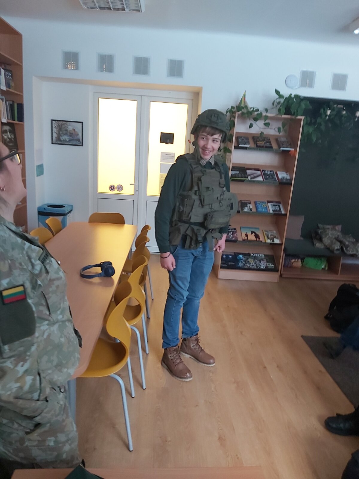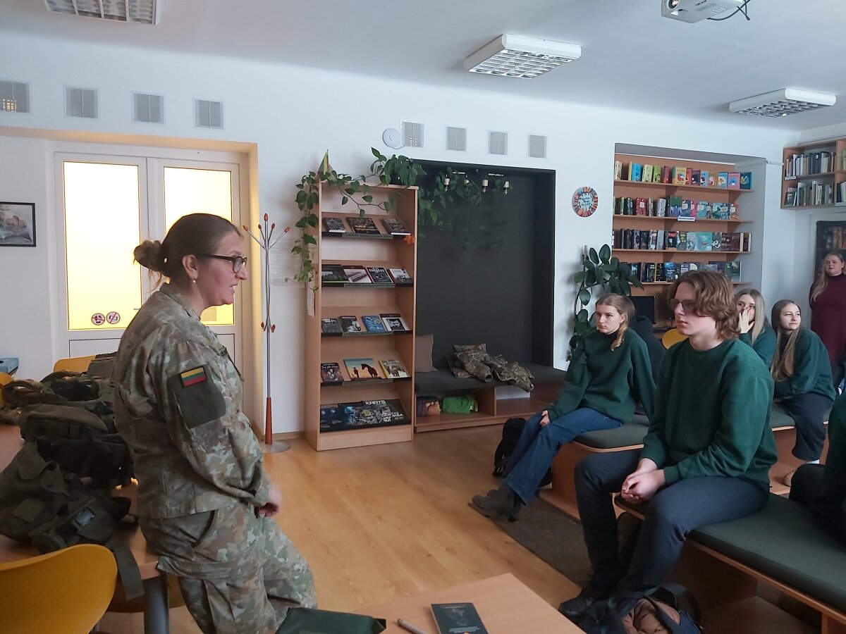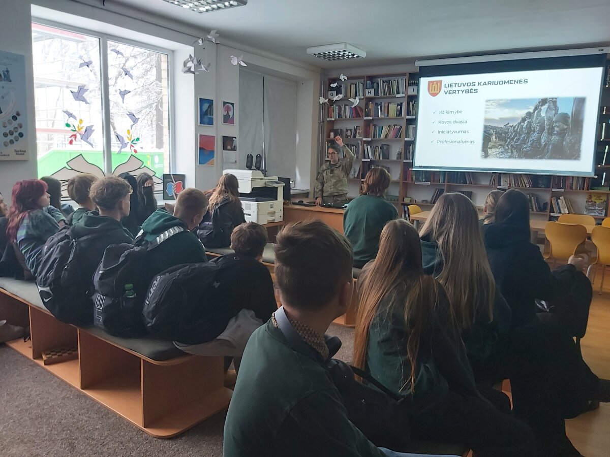 Lapkričio 23 d., minint Lietuvos kariuomenės dieną, mokyklos bibliotekoje lankėsi Gedimino štabo seržantė Edita Gudauskienė. Ji 9 klasės mokinius supažindino su Lietuvos kariuomenės vertybėmis, misija, struktūra, užduotimis, turima kario ekipuote ir ginkluote. Mokiniai gavo atsakymus į juos dominančius klausimus ir galėjo pasimatuoti apsauginę kario liemenę. Susitikimas įnešė daugiau įvairovės į gyvenimo įgūdžių pamoką ir padėjo geriau pažinti kario profesiją.