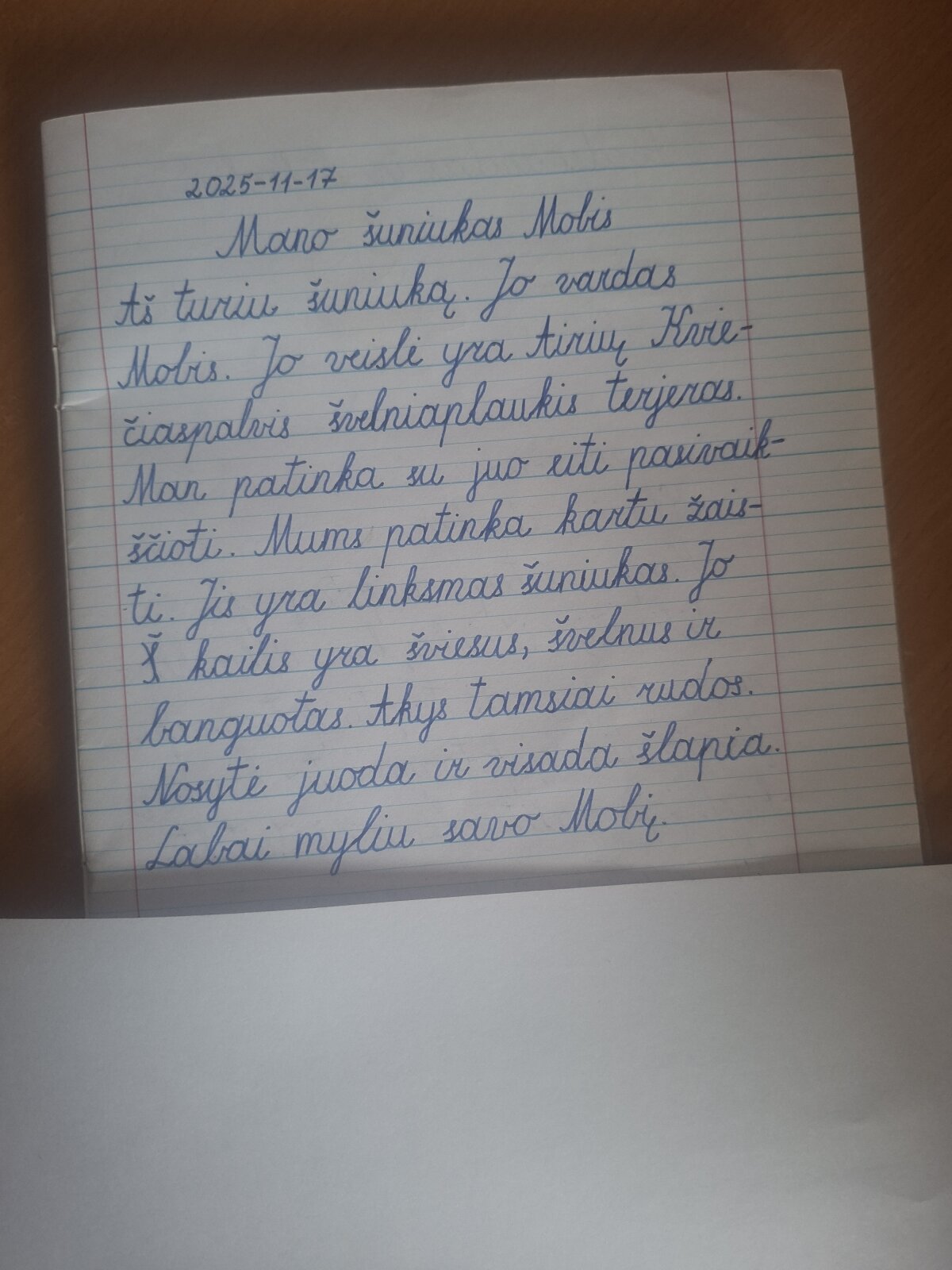 Urtė iš 7a pasakojo apie savo lygiaplaukę retriverę Ają ir jos nuotykius. Ariana iš 2a džiaugėsi savo gimtadienio dovana – miela maltipoo veislės Karamele. Klausėmės Ado iš 5a istorijos apie pabėgusią Runą, kuri, pasirodo, pati surado draugus ir net „išgelbėjo“ juos ežere. Luka iš 2a aprašė savo Mobį sąsiuvinyje, o Perlos Tora ir Sofijos mopsė Stela, pasak šeimininkių, visada džiaugiasi atvykusios pas močiutę. Dorotėjos šuo Niko dėl skaniuko gali ilgai suktis ratu, o Kotrynos iš 2c Bruno savo pirmojo gimtadienio proga buvo ypač išpuoštas ir apdovanotas.