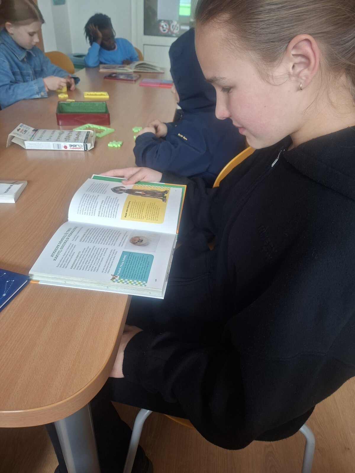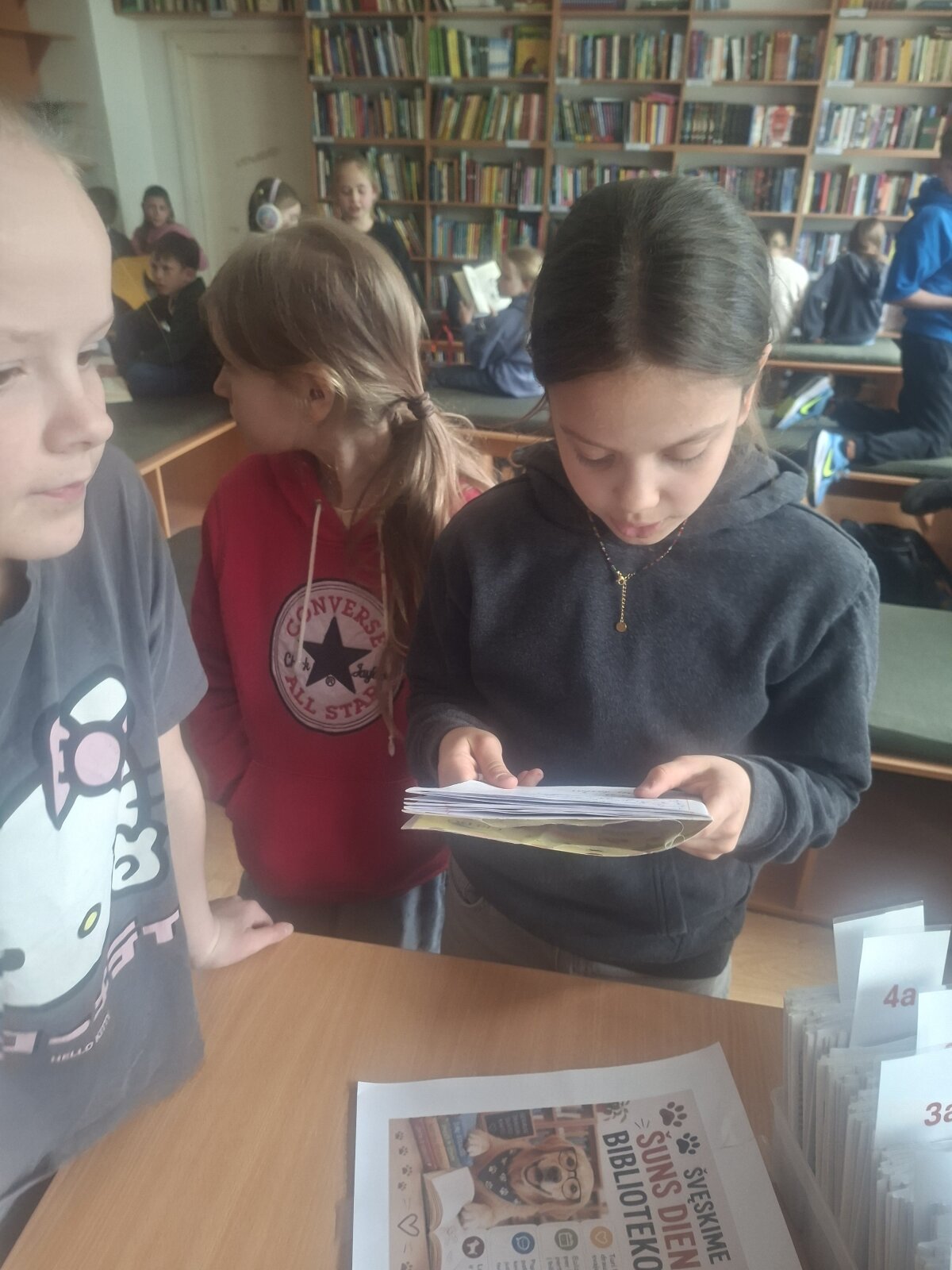 Ne mažiau džiugino ir tai, kad bibliotekos lentynos tą dieną beveik ištuštėjo – mokiniai susidomėję skaitė knygas apie šunis ir jų istorijas.