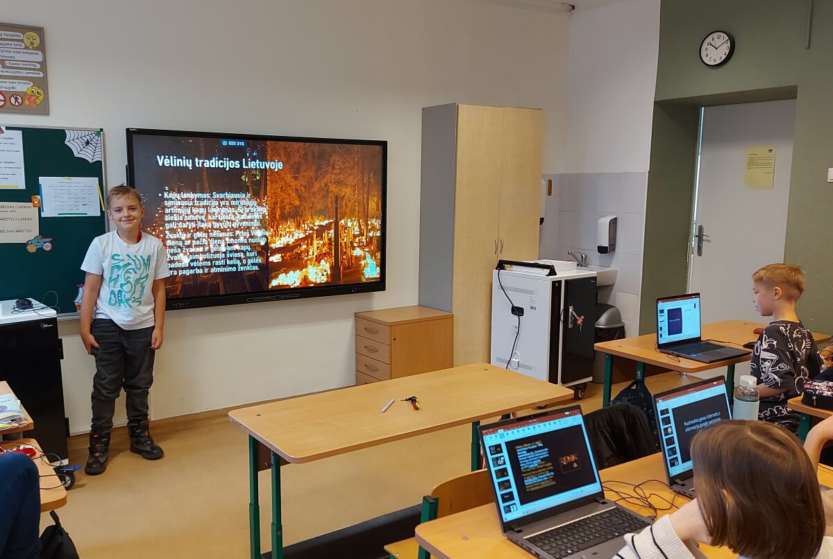 Spalio 31 d. 4a klasės mokiniai domėjosi Vėlinių ir Helovino šventėmis. Ketvirtokai ieškojo informacijos apie šias šventes ir „Powerpoint“ programa kūrė pristatymą. Įdomu buvo patiems sužinoti apie jų kilmę, palyginti šias šventes, papasakoti apie tai bendraklasiams. Vėliau technologijų kabinete gamino Helovino vaišes. Kepė bandeles-dešreles mumijas ir saldžiąją braškelę. Vaišindamiesi kalbėjo apie tai, kad Helovino šventė jiems patinka labiau.