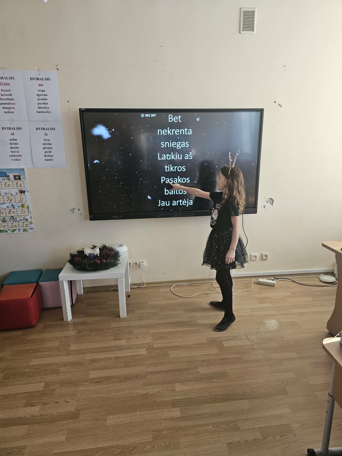 Dailės ir muzikos pamoką vedė Urtė, Austėja ir Aistė. Jos skatino mokinius kruopščiai atlikti pateiktas užduotis. Pamokos metu mokiniai kartu dainavo kalėdines dainas bei klausėsi ramios kalėdinės muzikos.