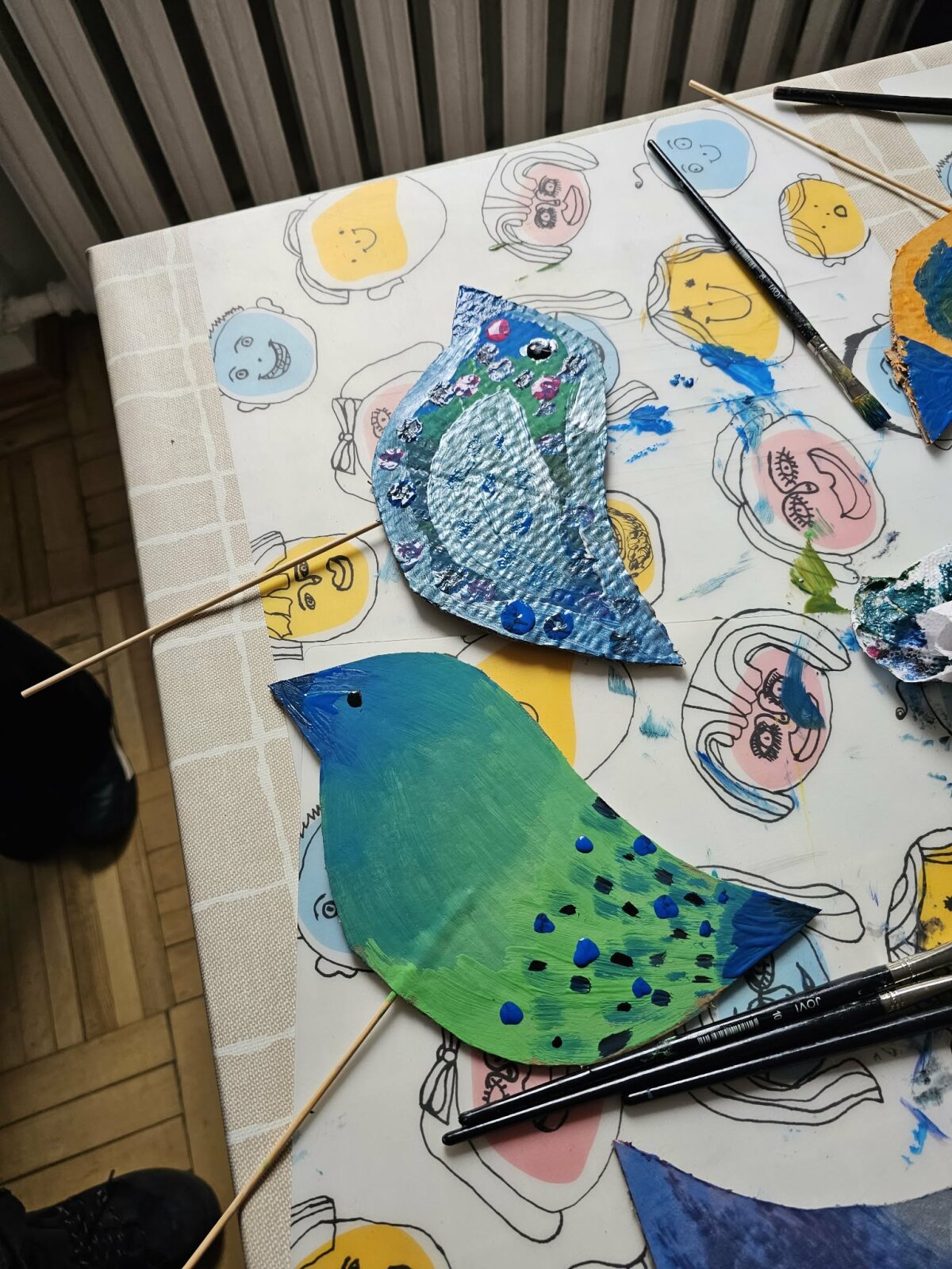 Kūrybinėje dalyje kiekvienas mokinys pasirinko jam labiausiai patikusį paukštį ar jo giesmę ir bandė ją perteikti meninėmis priemonėmis – spalvomis, linijomis, formomis.