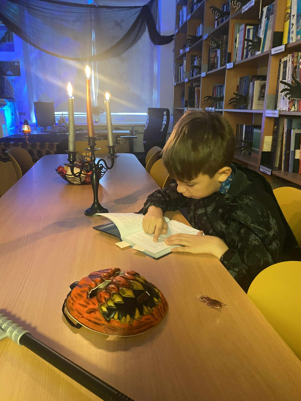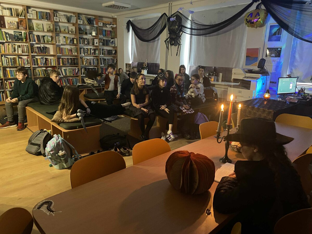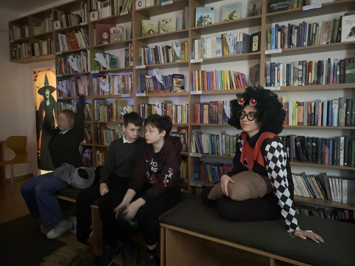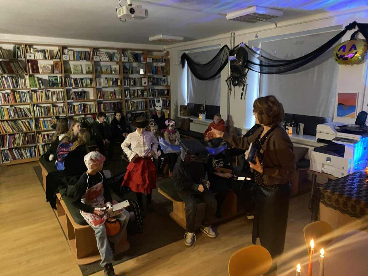 Bibliotekoje tvyrojo tikra Helovino dvasia – tamsi, bet kupina kūrybos ir vaizduotės. Dėkojame bibliotekininkei Daivai, kuri pakvietė mokinius į šią nuostabią patirtį, pasirūpino bauginančia atmosfera ir visus pavaišino gardžiais sausainiais bei saldainiais. Visi dalyviai išėjo su šypsenomis ir pažadu dar ne kartą sugrįžti į kraują stingdančių istorijų pasaulį.